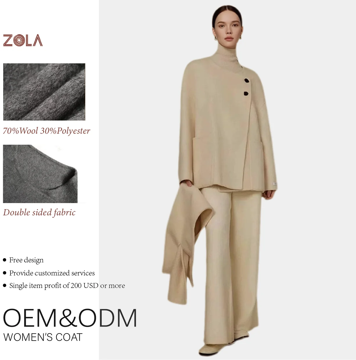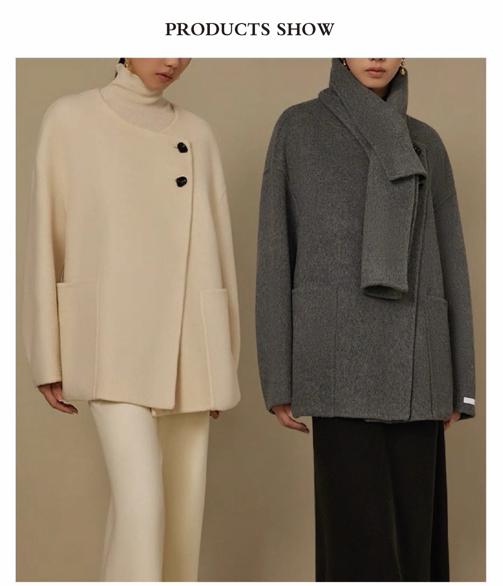High Quality Lady's Woolen Coat with Scarf Solid Color Handmade Double Sided Winter Keep Warm